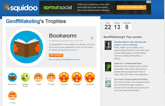 Like many social platforms, Squidoo is a total time suck and isn’t for everyone. You need to enjoy the experience of making lenses and taking part in the community if you’re to benefit at all. Looking at it only as a promotional tool probably won’t work. In addition, you’ll probably need to create more lenses than just your book ones, and this means that you need to actually enjoy using the website. I’ve created lenses in Pets,  Entertainment and How To as a way to draw traffic to my profile and build my squidoo presence.